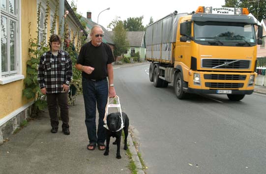 – Jag lyssnar om det kommer någon bil, och när det är fritt ger jag signal till Dante att vi skall gå över, säger Leffe. Men om det är något jag skulle vilja be smedstorpsborna om så är det att ta det lugnt när ni kör genom byn. Skall jag vara riktigt ärlig så tycker jag att folk kör för fort. Och även om Dante har fått sitt namn efter den italienske författaren på 1300-talet som skrev om sitt inferno, så tycker jag inte han skall behöva uppleva ett eget trafikinferno här i byn. Under de sex år vi bott här i byn är det faktiskt bara vid tre tillfällen som en bil stannat när de sett att jag och hunden är på väg att gå över. Kanske kan ni bättra på den statistiken?
