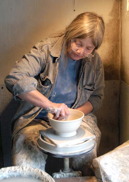 Det sprakar gott i kaminen i verkstaden. Medan vi pratar och Kristina fotograferar arbetar Cecilia vid sin drejskiva. Skivan snurrar, vatten på leran, händer som formar. Ur en klump porslinslera från Australien växer det fram en välsvarvad potta mellan Cecilias skickliga händer.