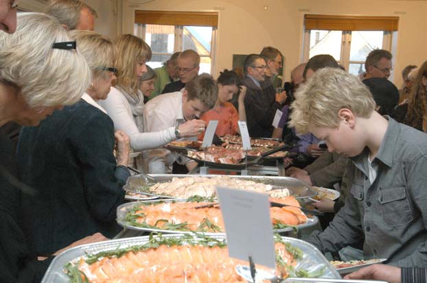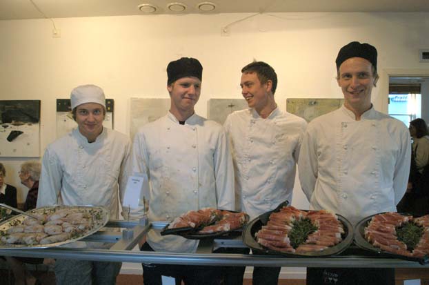 De fyra unga kockarna, som stod bakom den välsmakande buffen, går sista året på restauranglinjen på Österlengymnasiet i Simrishamn. Avgångselevernas specialarbete skall vara av storkökskaraktär och omfatta 100 timmar. Normalt brukar detta bli ett teoretiskt arbete som presenteras skriftligt. På Galler i Banken fick dessa fyra unga killar chansen att göra det ?live?. Efter en given budget och med kravet att använda bra råvaror från Österlen arbetade de fram ett meny-förslag. I samråd med Gun fastställdes sedan menyn. I arbetet ingick också att kockeleverna skulle beräkna åtgång samt ansvara för uppläggning och servering. För nybakade unga kockar torde det ha varit en utmaning att beräkna åtgången då antalet gäster under kvällen var uppemot 300. Att döma av de så gott som tomma uppläggningsfaten vid kvällens slut får man dra slutsatsen att gästerna uppskattat maten och att beräkningen av åtgång varit perfekt!