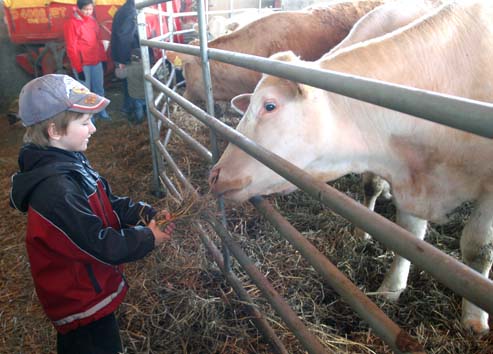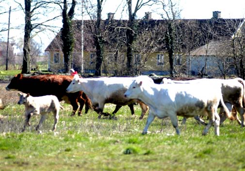 Först kom mammorna. Sedan blev det en paus. Men så stack det ut ett litet huvud som försiktigt kikade åt alla håll. Och så tog han, (kan han ha hetat Ferdinand?), mod till sig och klev ut. Och då vågade även kamraterna komma med. Det hoppades och sprättes i jorden och stångades lekfull. Förtjusta barnskratt och förundrade kalvbröl blandades med kossornas rop in till vännerna där inne att de också borde komma ut. Att kor kan vara så viga visste nog inte många av oss som tagit oss till Larsbo denna dag.