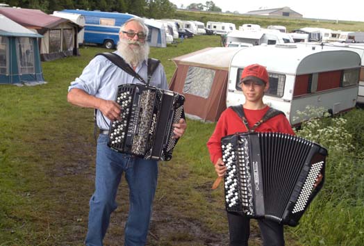 Varje år sedan 1969 har Sture och Britt Andersson ordnat dragspelsgille för sina spelkamrater från Skåne och Småland. Jag gör det här för att sprida den glädje jag själv fått uppleva genom att spela dragspel, säger Sture Andersson. Dragspelet har kommit lite på undantag och det tycker jag är synd eftersom vi som håller på har så roligt när vi träffas. 50 husvagnar och 170 personer hade samlats på ängen hos Britt och Sture. Vals och tango i alla hörn och grillat mellanfläsk till mellanmål. Fler ungdomar borde upptäcka dragspelet säger Sture när han stämmer upp "Tulpaner från Amsterdam" på sitt Bugari-spel tillsammas med 14-årige Emil Nilsson från Sälshög.