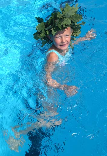 De större barnen som tagit kandidaten och magistermärken blev sedan promoverade och fick simma med krans på huvudet. Därpå var det tävlingar innan alla fick bada fritt resten av eftermiddagen.