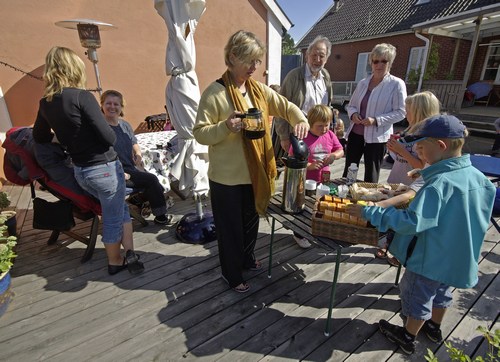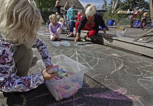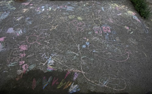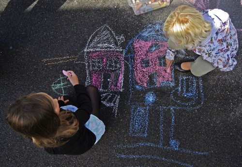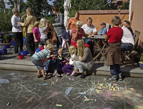 2009-09-04 I lördags var det barnsalong hos Gun och Evald på Galleri Banken. För andra året i rad bjöds alla barn in för att måla asfaltsgolvet på innergården med gatukritor. Det hängde hotande moln över byn alldeles innan men himlen sprack upp och gården fylldes med barn i alla åldrar. En stor låda med kritor sattes fram och barnen började genast rita. Samtidigt bjöds alla på fika och vi vuxna kunde njuta i solskenet av att se de 20 barnen skapa fritt på asfalten. Kreativiteten flödade och det var verkligen en en härlig eftermiddag.