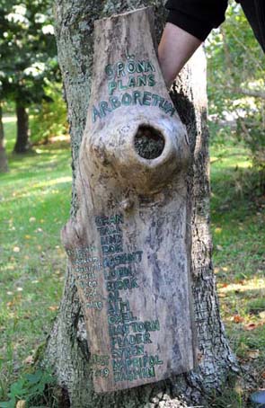 Detaljbild av den vackra skylten med namnen på alla träd som finns i Gröne Plans Arboretum