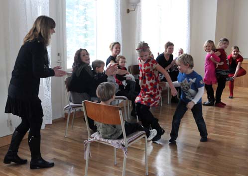 Såväl lite äldre barn som småtelningar med mammor, dans, leker och håller igång