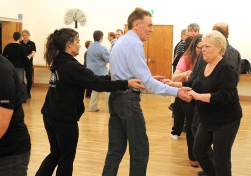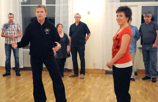 En del har kroppen fylld av dans och tycks ha slitit ut många dansgolv i sina dar, medan andra fortfarande är förundrade över sina egna alltför svårstyrda ben och armar och fötter. ”Det ser ju så lätt ut, Mjukt och fint, och rytmiskt.” Men det är väl så med det mesta som ser lätt ut, det har krävt lång och idog träning. ”Det enkla är det svåra”, som någon vis person sa en gång. Dansledaren Einar Mårtensson, som har Maria Ohlsson med sig som partner går lugnt igenom de olika momenten i dansen. Demonstrerar, låter deltagarna pröva och ger med bestämd stämma såväl ris som ros åt de dansande. Han hjälper nybörjarna att finna de rätta stegen, och manar till träning. Hans pedagogik grundar sig på dansandets viktigaste komponenter – lyssna till musiken, finn takten, hitta din balans och timing. Lätt som en smäck kan tyckas men ack nej! Det är ju inte bara öronen, som skall lyssna utan hela kroppen, som genom sitt lyssnande skall fyllas av musiken. Kombinationen av dansens ingredienser är ju det som skapar upplevelsen och kvaliteten på dansen. Einar Mårtensson beskriver det hela som ett maskineri, där musiken är kugghjulet, i vilket damen ska haka fast i en kugg, mannen i en annan och tillsammans ska de utgöra en rytmisk helhet. Ja, ja teorier i all ära – men det är bara träning och övning som ger färdighet och det är ju därför alla är där.
