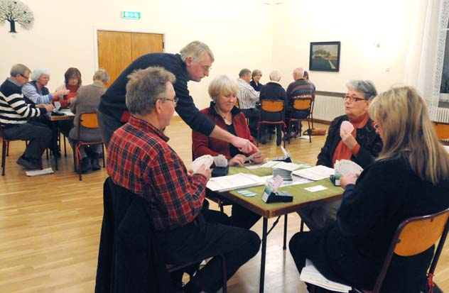 Med en sådan entusiastisk instruktör är det bara att kämpa på och försöka göra läxan bättre till nästa gång. Trött blir man av att försöka räkna poäng och komma ihåg vilka kort som gått, men å andra sidan kopplar men bort alla eventuella bekymmer och jag kan garantera att man somnar gott när man kommit hem. Dessutom får vi Ullas goda smörgåsar till kaffet vilket gör kvällarna ännu trevligare.